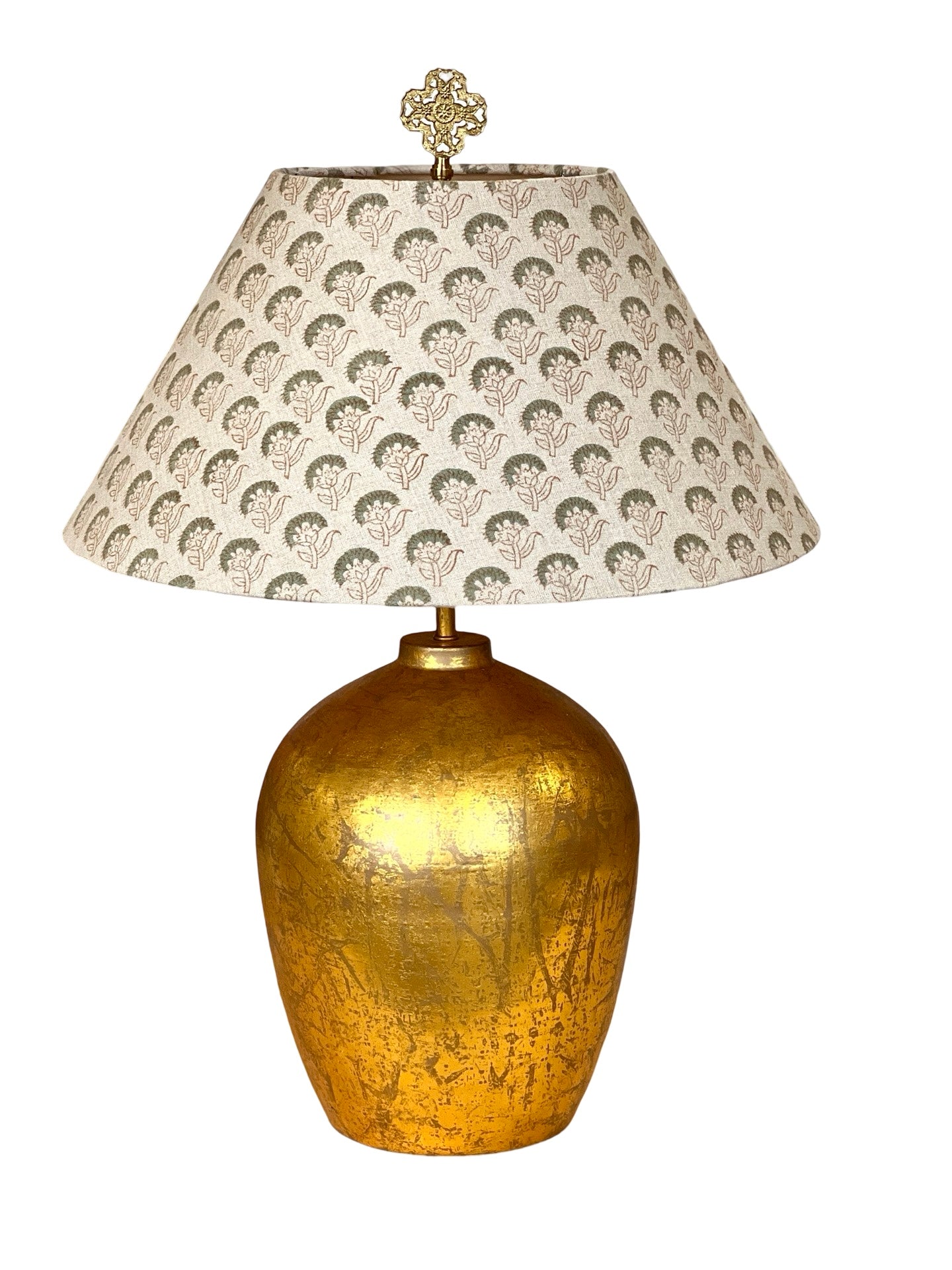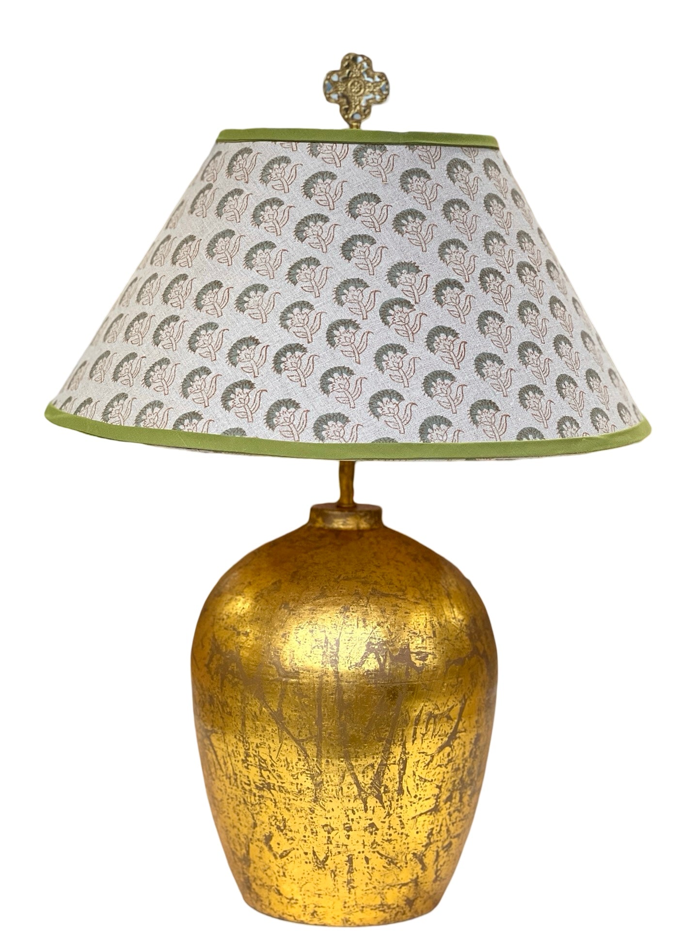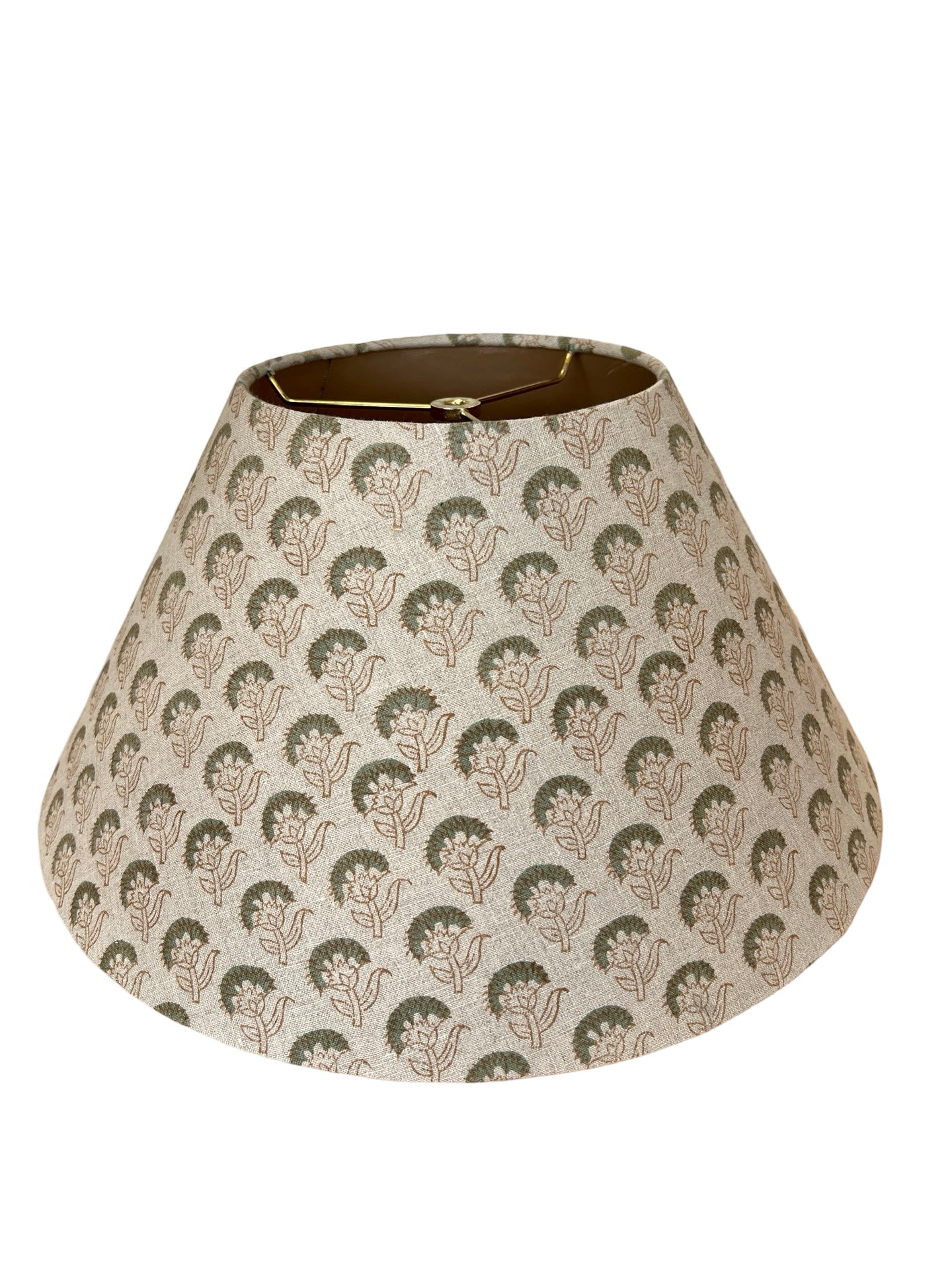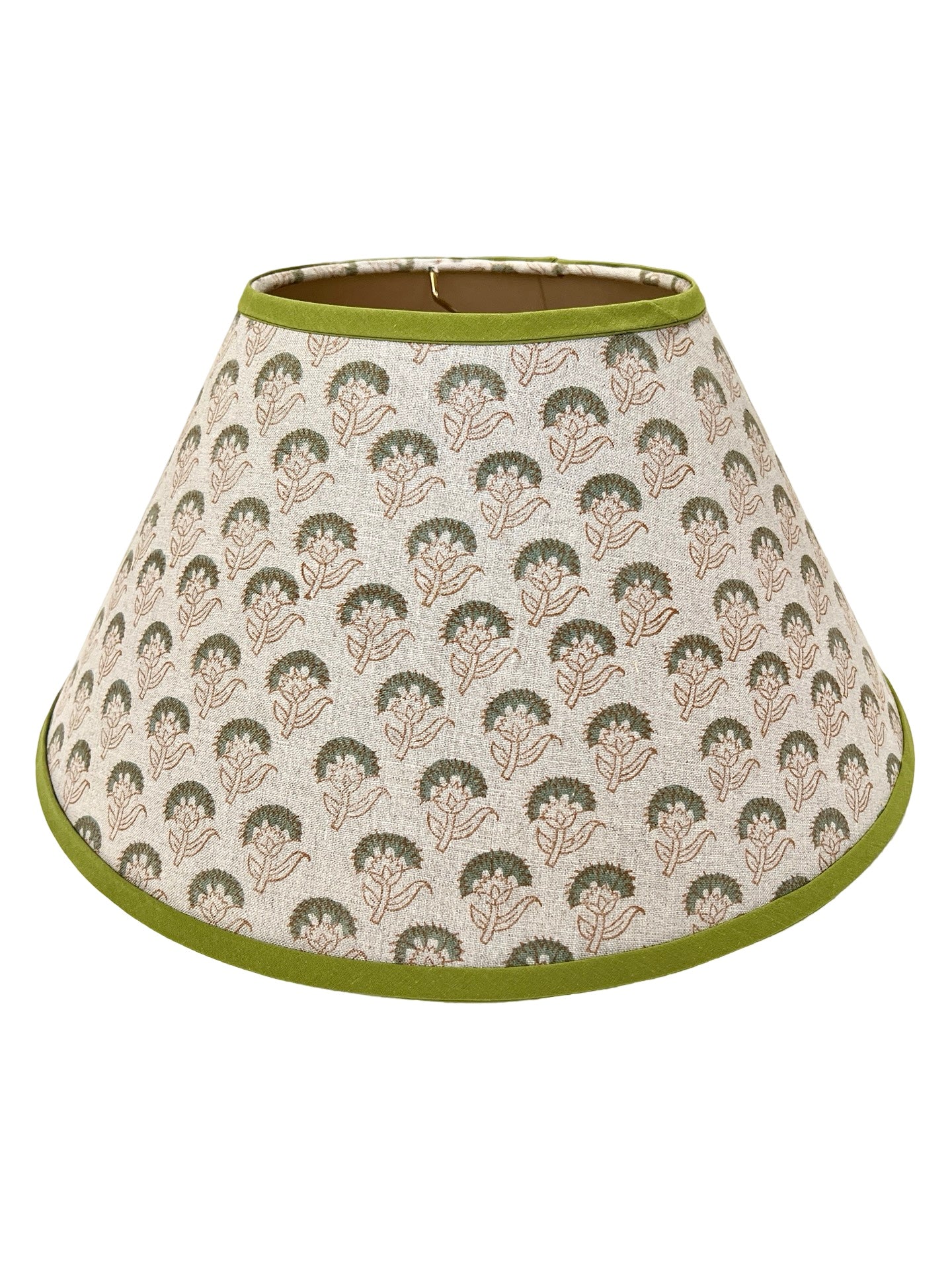 Introducing "Ujala" from The Illume Collection, a celebration of timeless artistry and modern elegance. This shade features an empire silhouette and is crafted from pure linen hand block-printed fabric, using traditional Indian techniques. This traditional style abstract Indian floral pattern brings a touch of casual sophistication to any space. The top and bottom of the shade have a rolled edge and are finished with a sage green cotton herringbone trim, complemented by a cream-colored cotton lining. Each lampshade is meticulously handcrafted in our Charleston, SC workshop. (Due to the handmade nature of this material, color and pattern may vary slightly.)