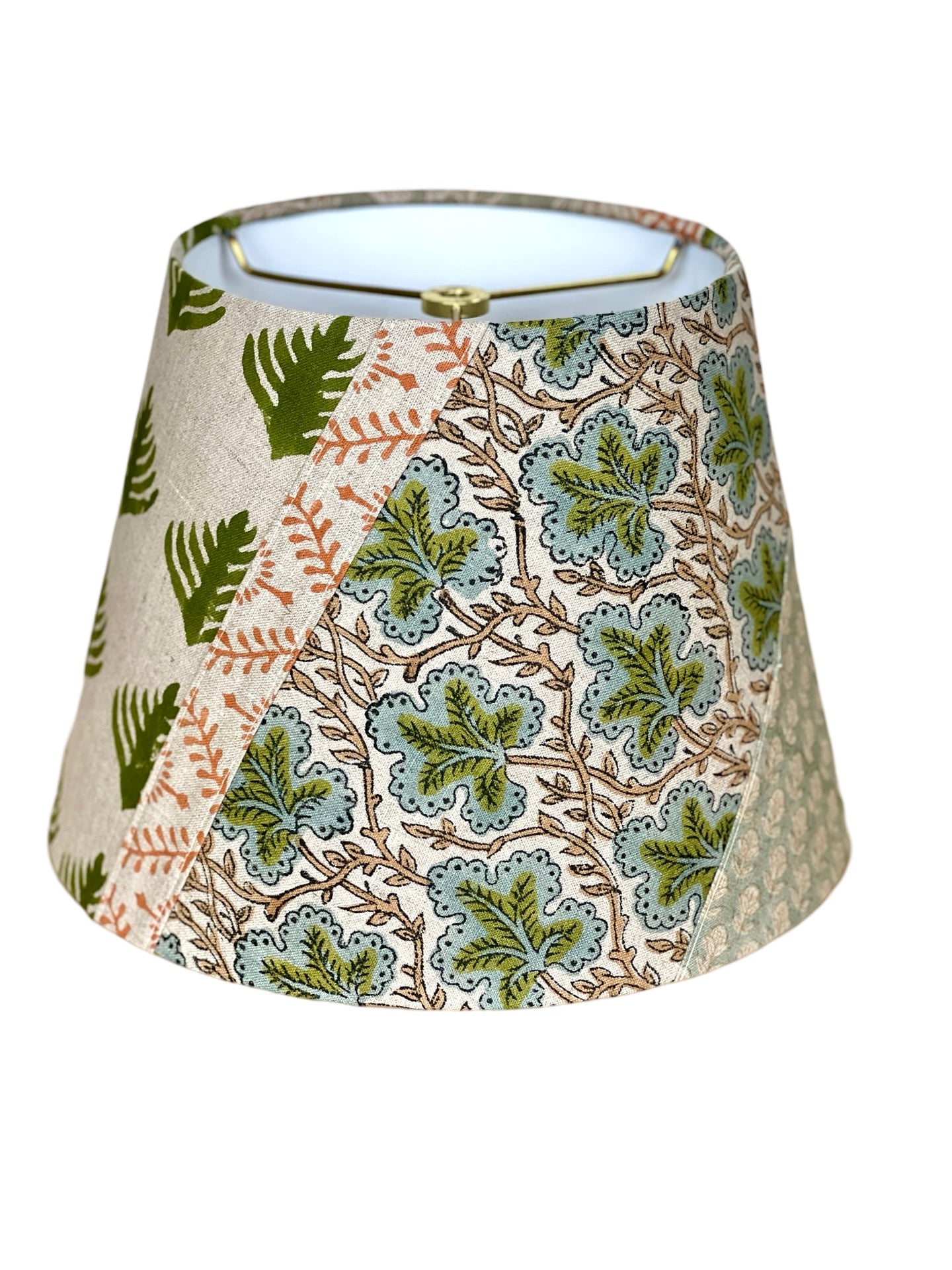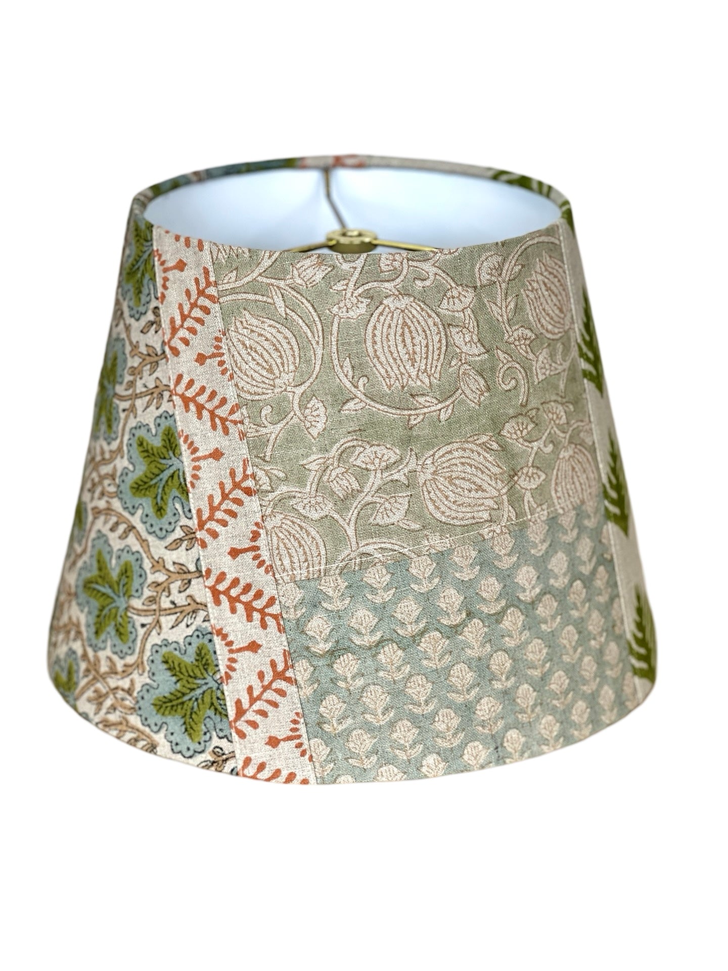 Introducing the quilted Bespoke Empire Lampshade from The Luminary Collection, a celebration of timeless artistry and modern elegance. This shade features an empire silhouette and is crafted from pure linen hand block-print , and then hand sewn in a unique design to create an entirely unique textile - a patchwork quilt. The intricate mix of florals and design patterns bring a touch of grace to any space. The top and bottom of the shade have a rolled edge. Each lampshade is meticulously handcrafted in our Charleston, SC workshop. (Due to the handmade nature of this material, color and pattern may vary slightly.