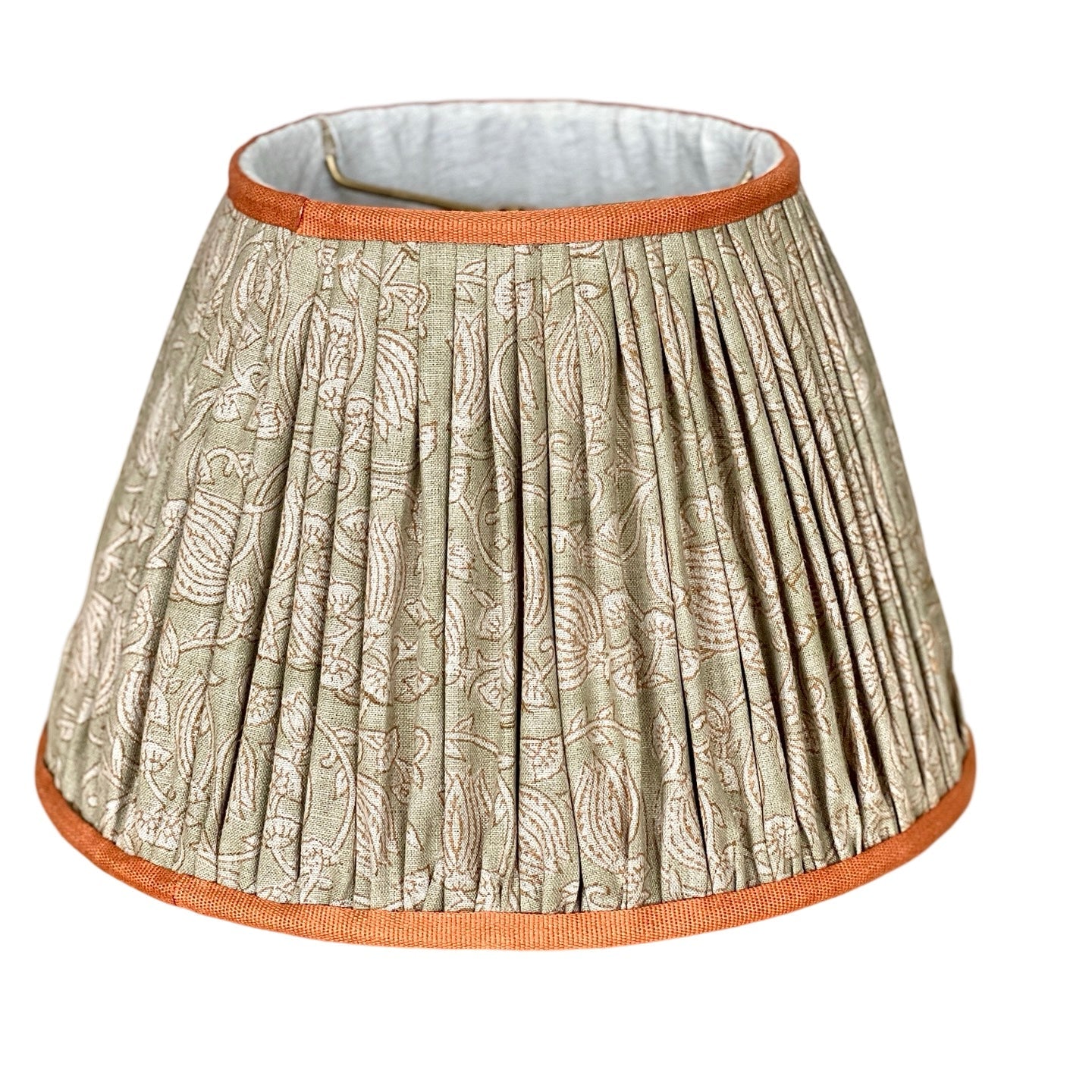 Introducing "Prakasha" from The Illume Collection, a celebration of timeless artistry and modern elegance. This shade features a pleated empire silhouette and is crafted from pure linen hand block-printed fabric, using traditional Indian techniques. This abstract Indian floral vine pattern on sage colored linen brings a touch of casual sophistication to any space. The top and bottom of the shade have a rolled edge and are finished with a salmon cotton herringbone trim, complemented by a cream-colored cotton lining. Each lampshade is meticulously handcrafted and sewn in our Charleston, SC workshop. (Due to the handmade nature of this material, color and pattern may vary slightly.)