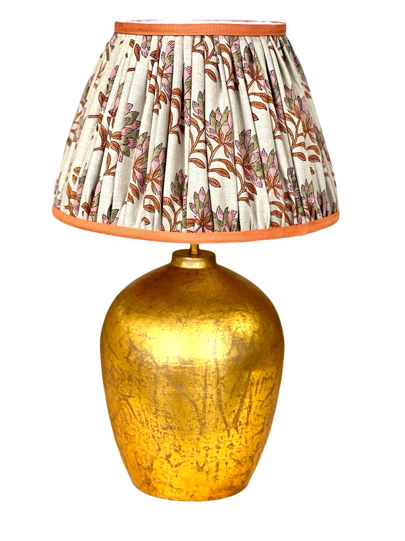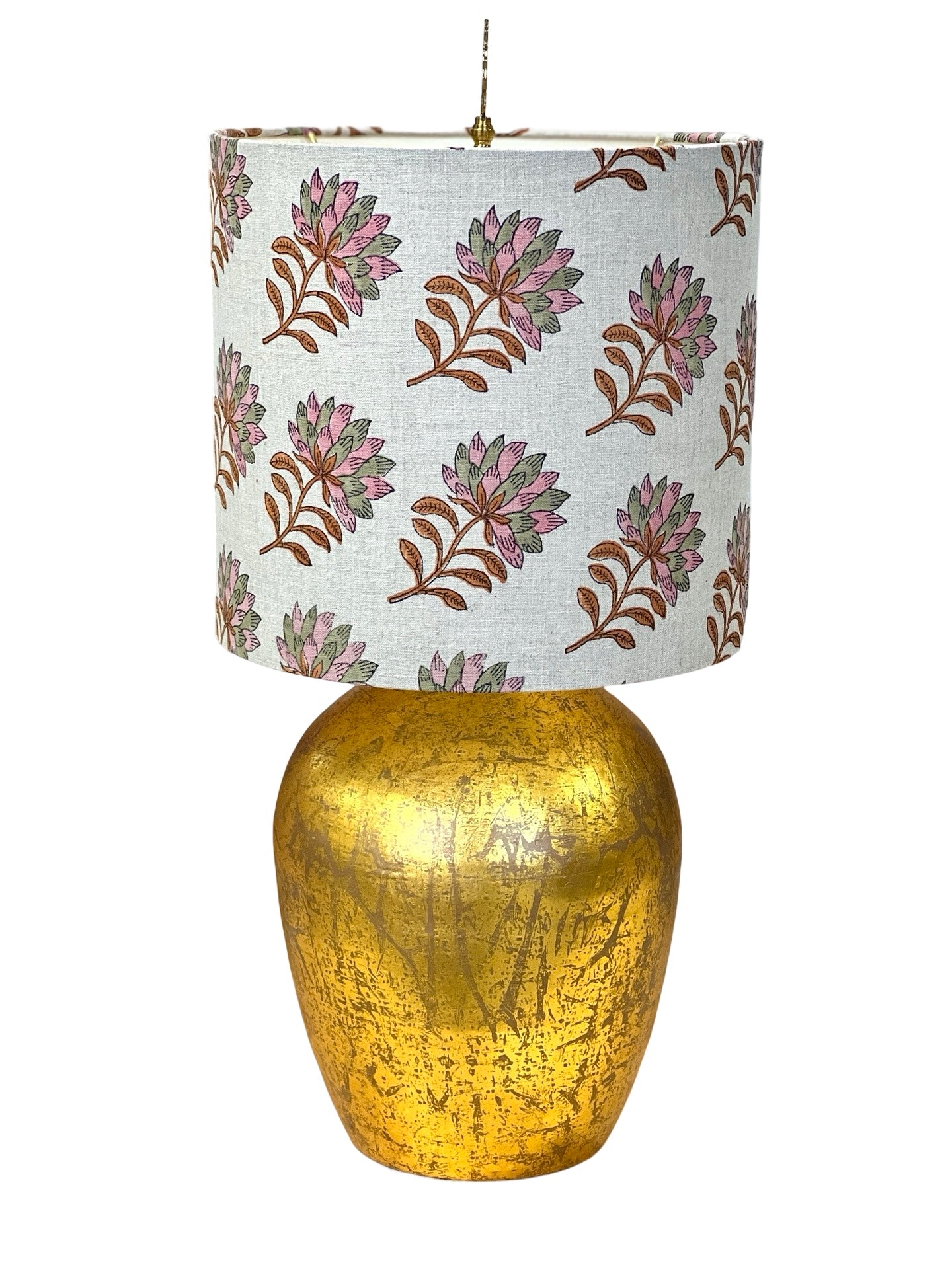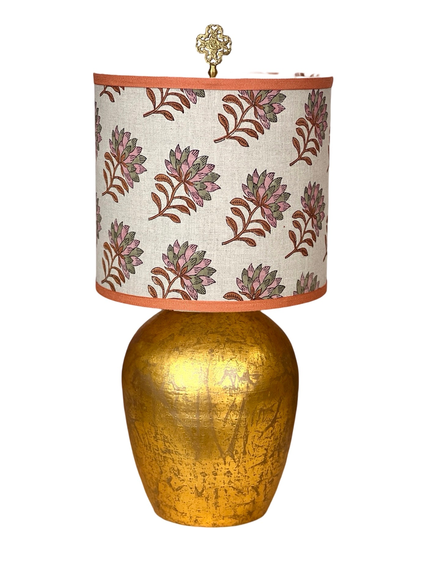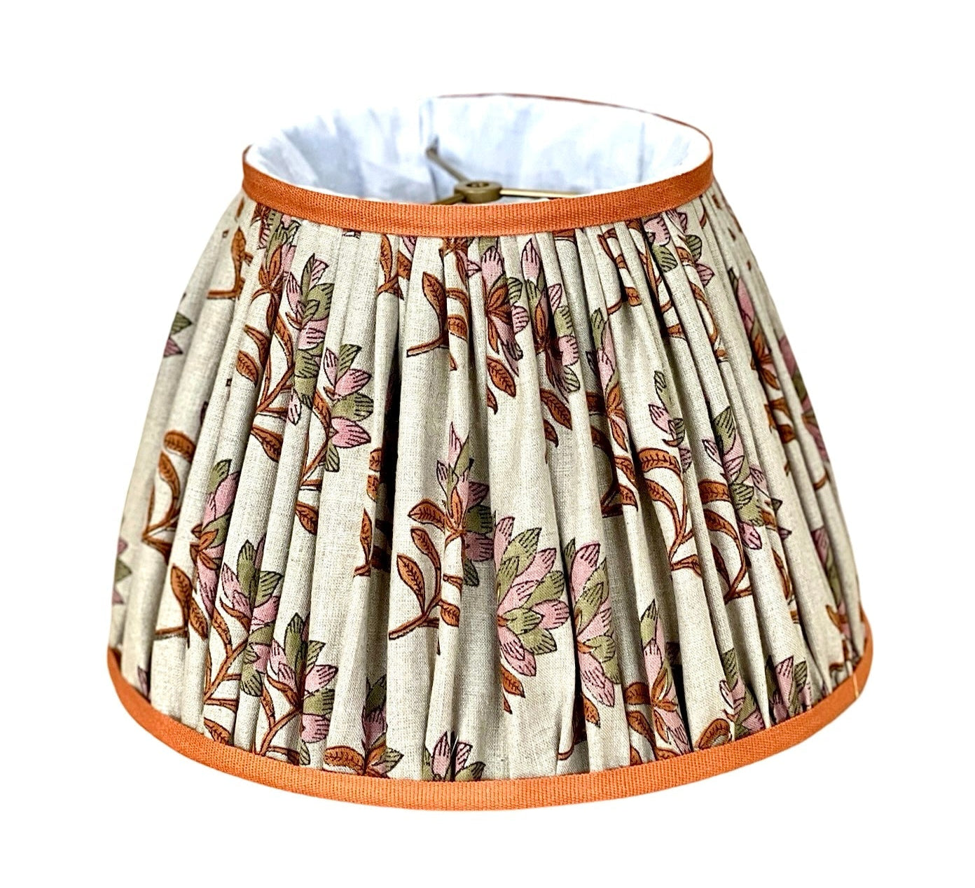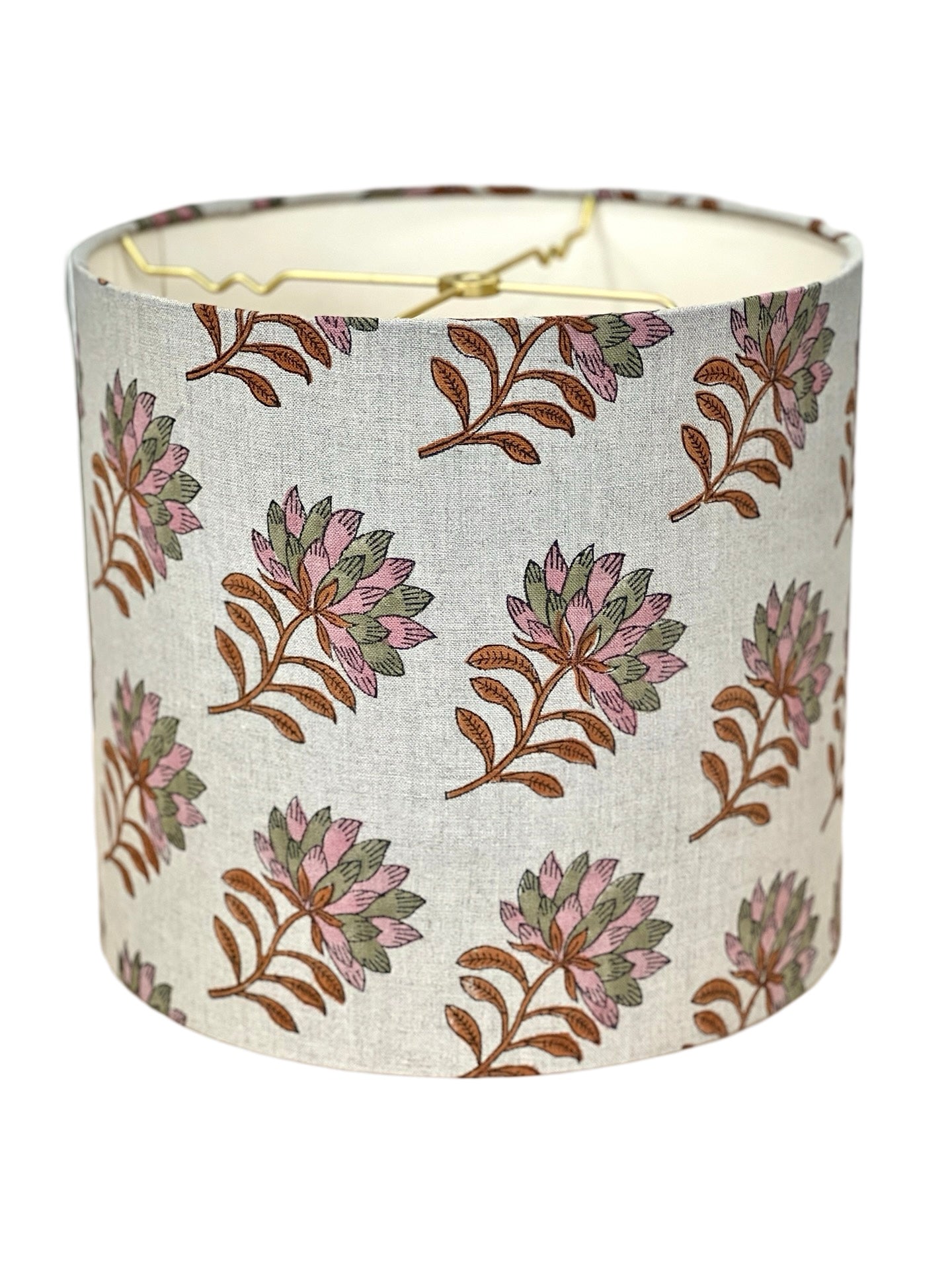 Introducing "Tejas" from The Illume Collection a celebration of timeless artistry and modern elegance. This shade features a drum silhouette and is crafted from pure linen hand block-printed fabric, using traditional Indian techniques. The repetitive peach and pink floral pattern on the raw linen brings a casual sophistication to any space. The top and bottom of the shade have a rolled edge and are finished with a salmon colored cotton herringbone trim, complemented by a cream-colored cotton lining.Each lampshade is meticulously handcrafted in our Charleston, SC workshop.