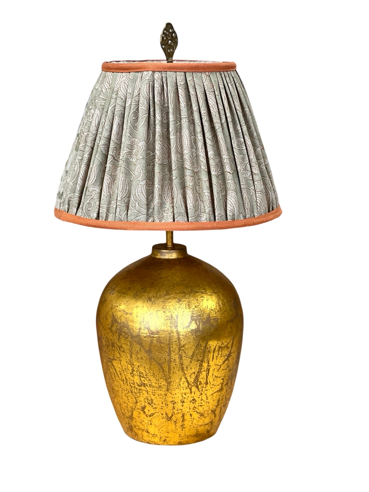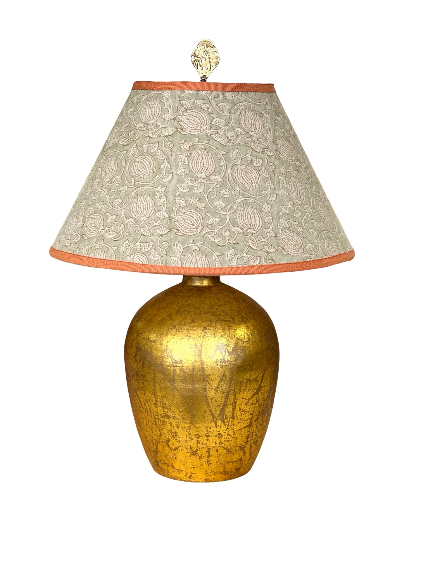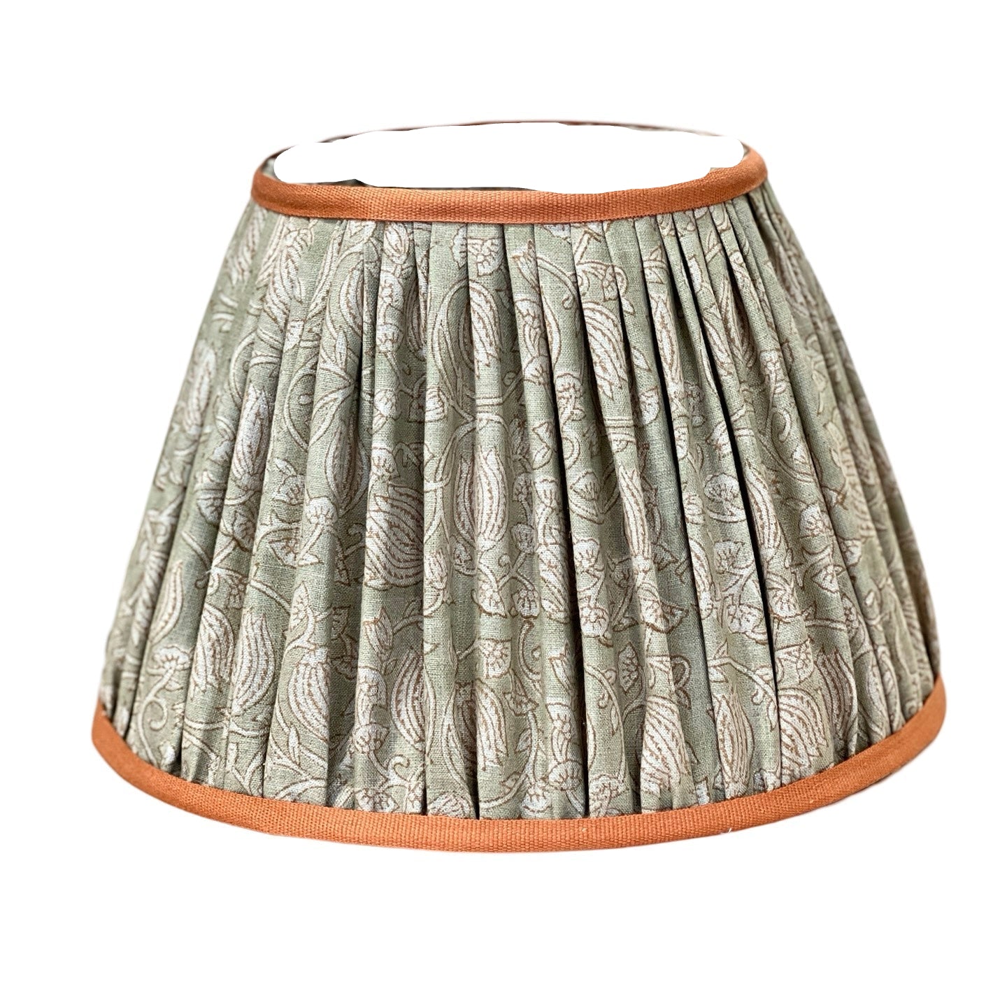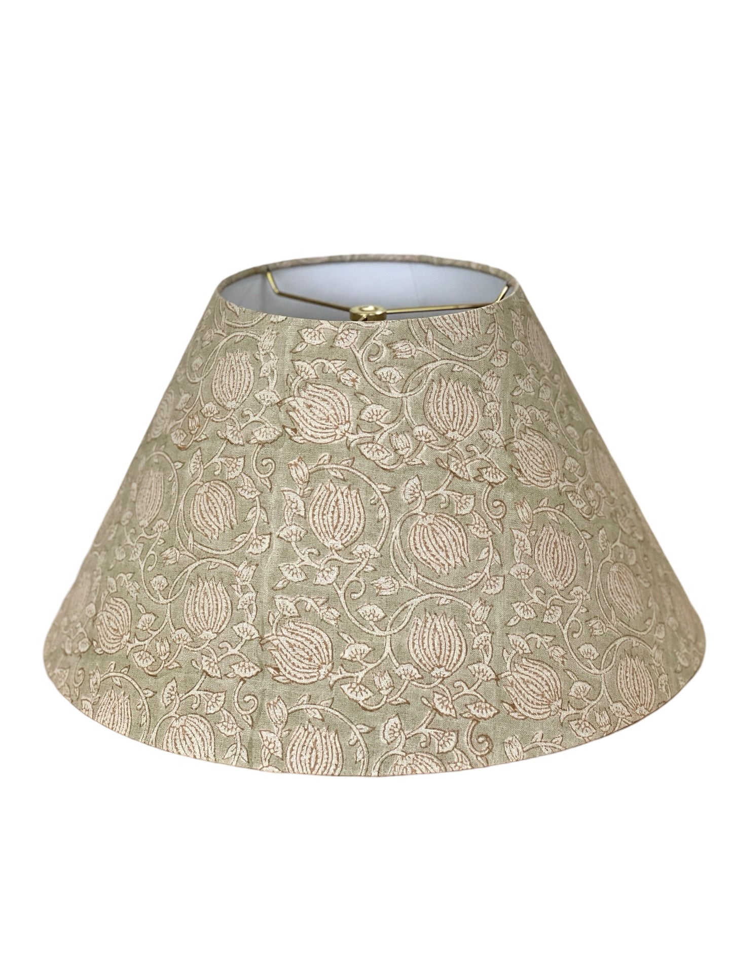 Introducing "Prakasha" from The Illume Collection, a celebration of timeless artistry and modern elegance. This shade features an empire silhouette and is crafted from pure linen hand block-printed fabric, using traditional Indian techniques. This abstract Indian floral vine pattern on sage colored linen brings a touch of casual sophistication to any space. The top and bottom of the shade have a rolled edge and are finished with a salmon cotton herringbone trim, complemented by a cream-colored cotton lining. Each lampshade is meticulously handcrafted in our Charleston, SC workshop. (Due to the handmade nature of this material, color and pattern may vary slightly.)