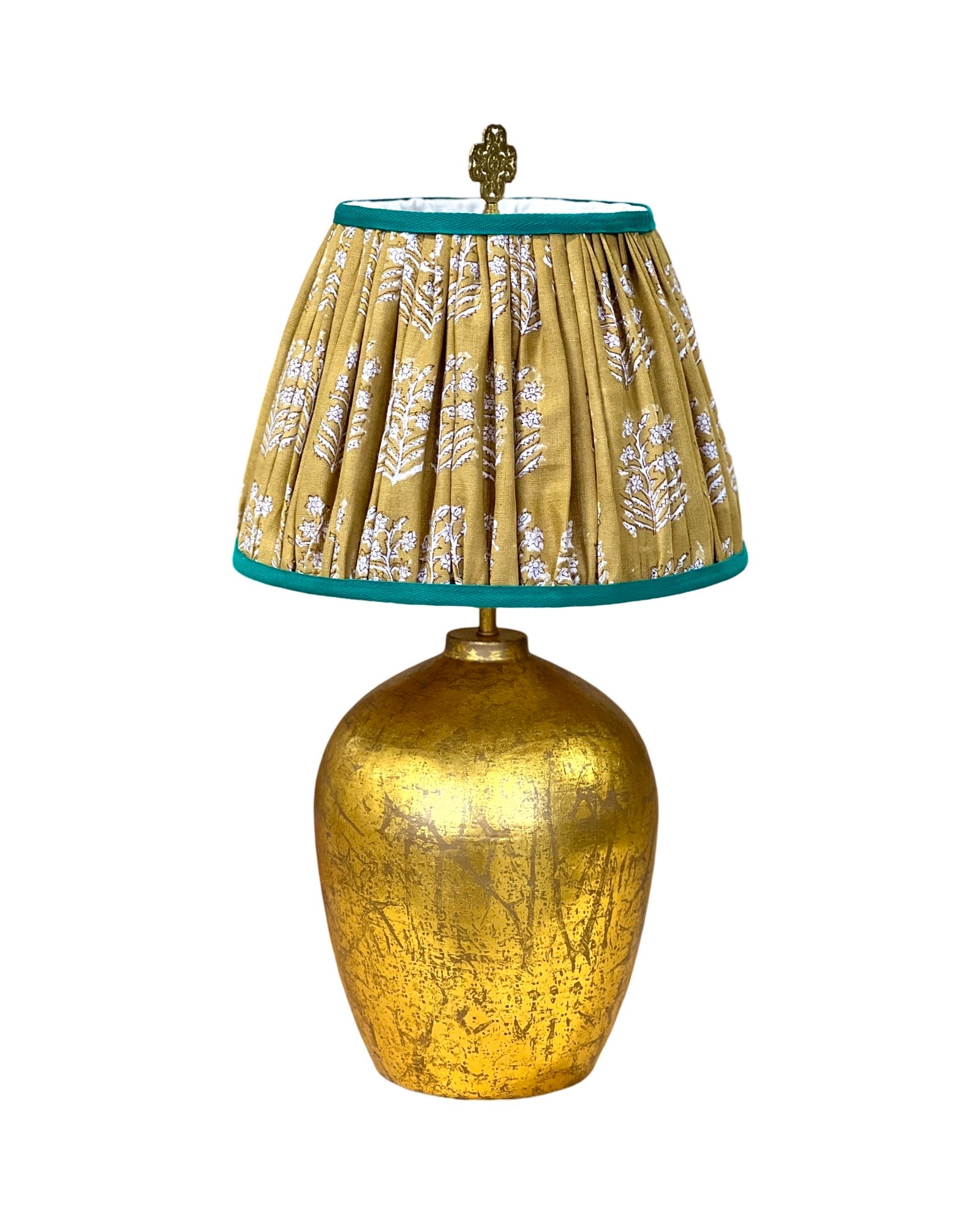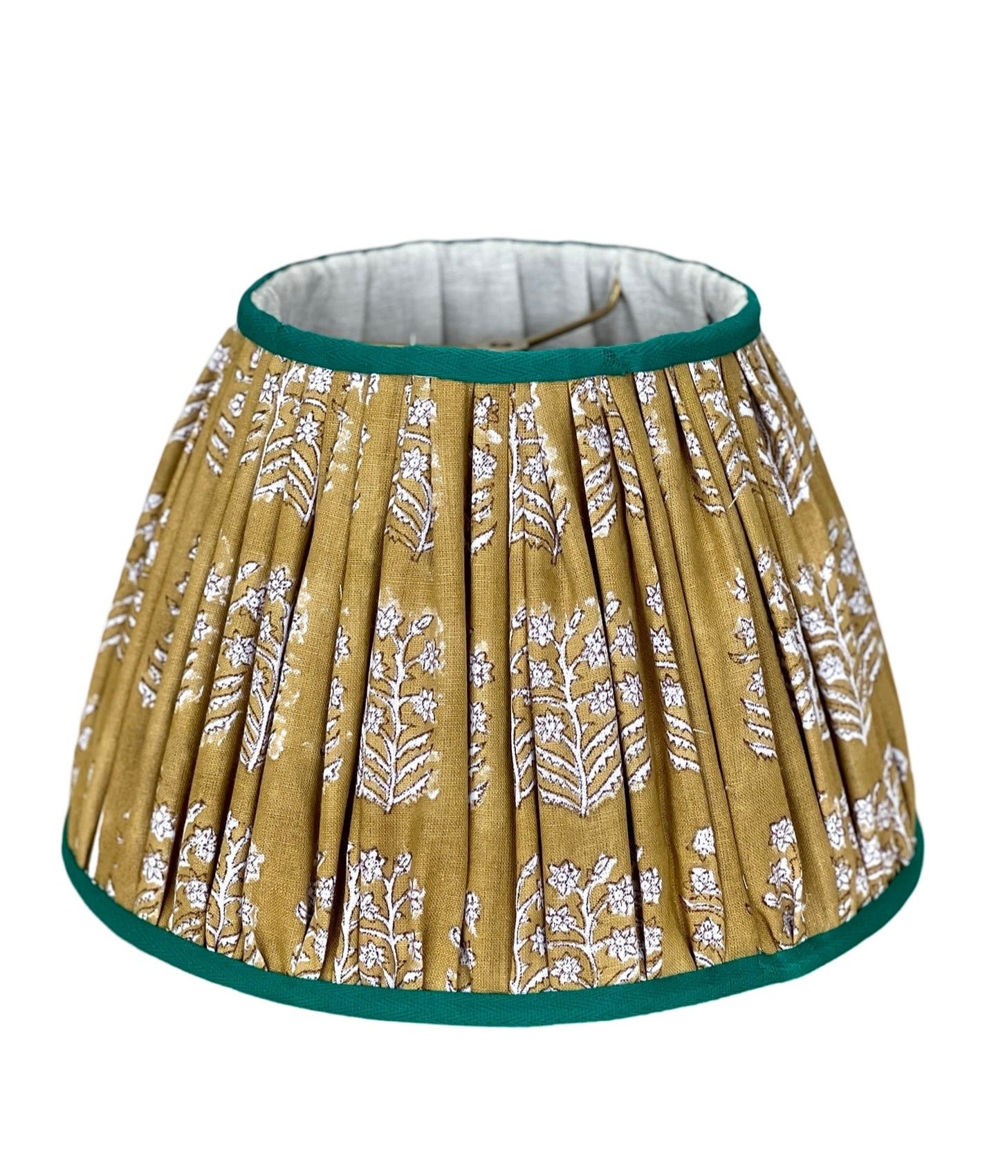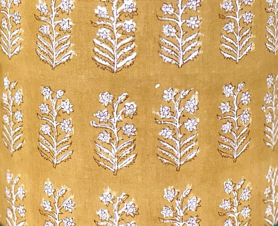 Introducing "Ujjwala" from The Illume Collection, a celebration of timeless artistry and modern elegance. This shade features a pleated drum silhouette and is crafted from pure linen hand block-printed fabric, using traditional Indian techniques. The repetitive white floral pattern on the gold fabric brings a casual sophistication to any space. The top and bottom of the shade have a rolled edge and are finished with a pop of peacock blue cotton herringbone trim, complemented by a cream-colored cotton lining. Each lampshade is meticulously handcrafted in our Charleston, SC workshop. (Due to the handmade nature of this material, it will have some variations in color saturation.)