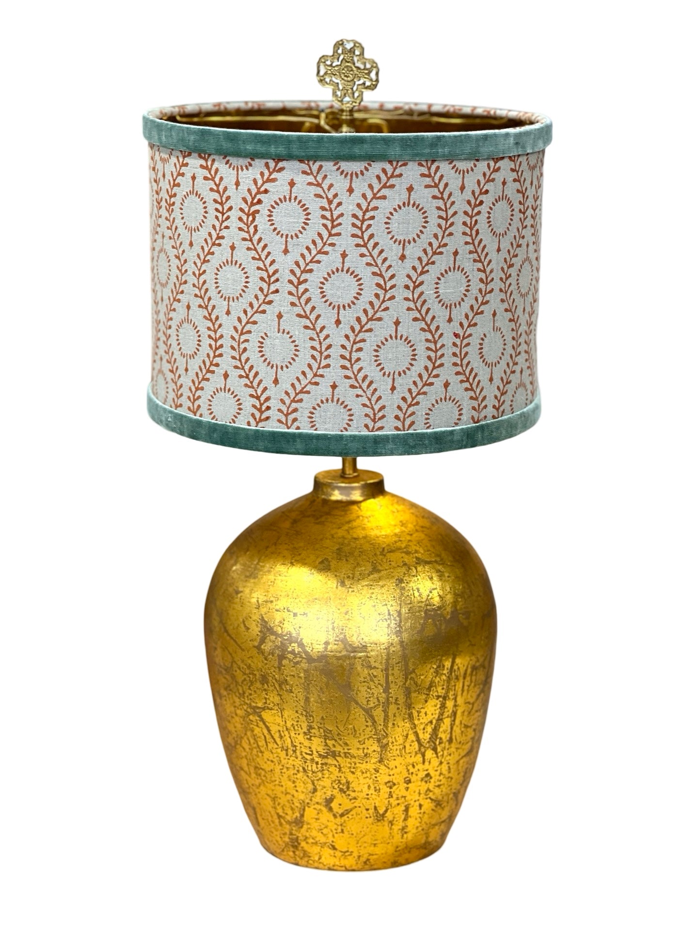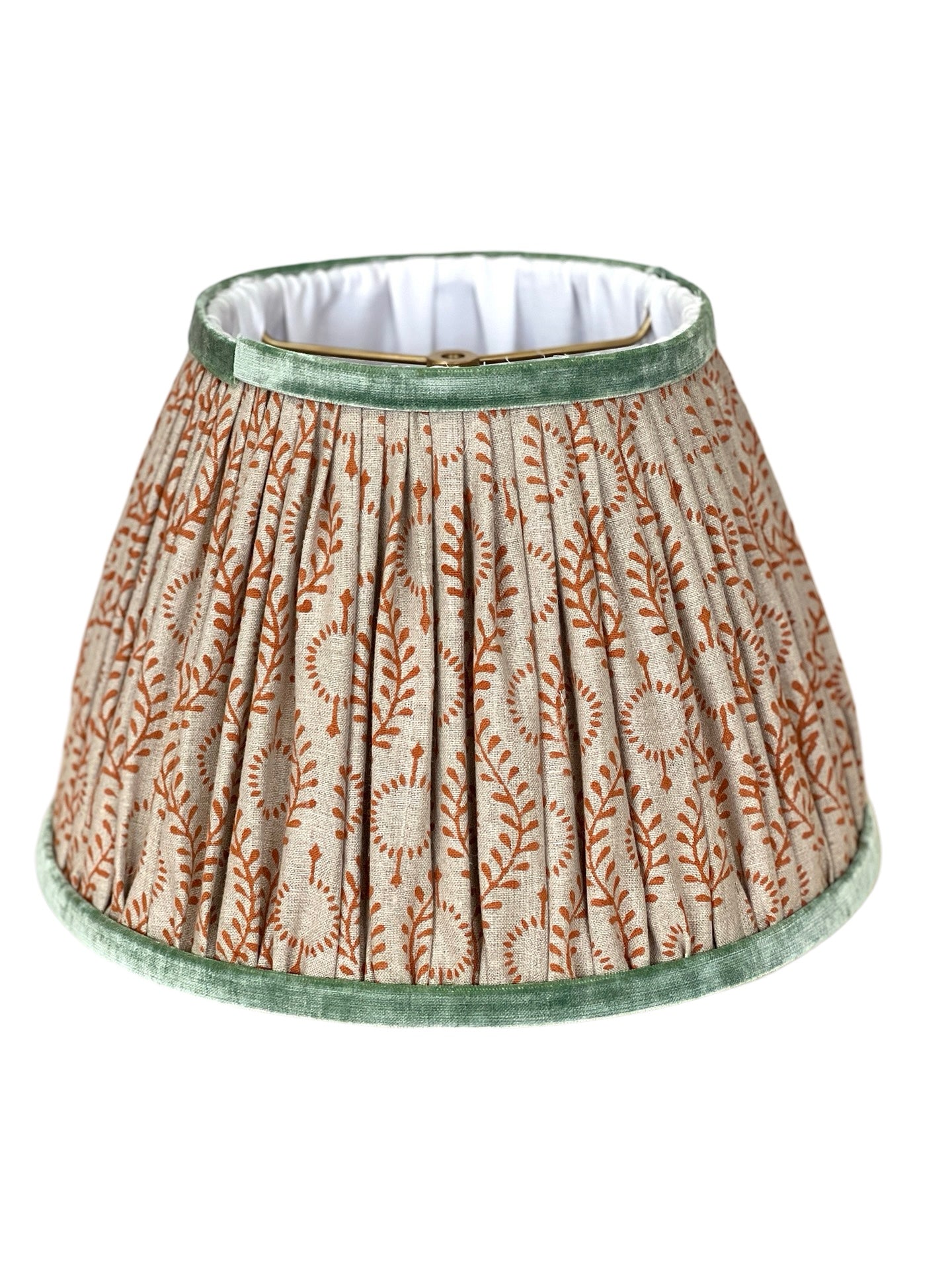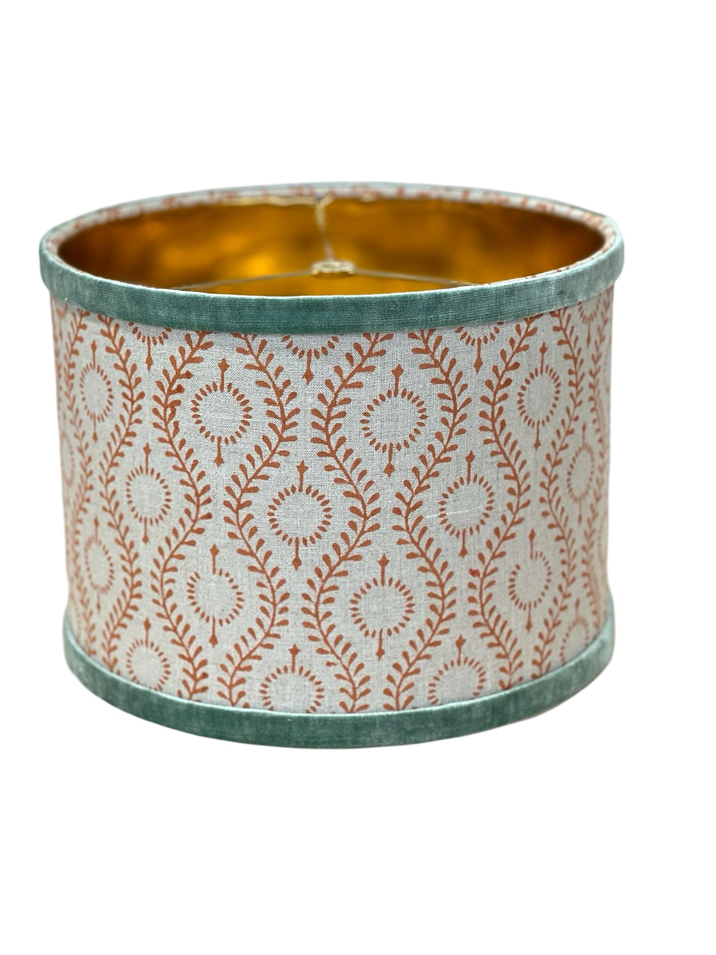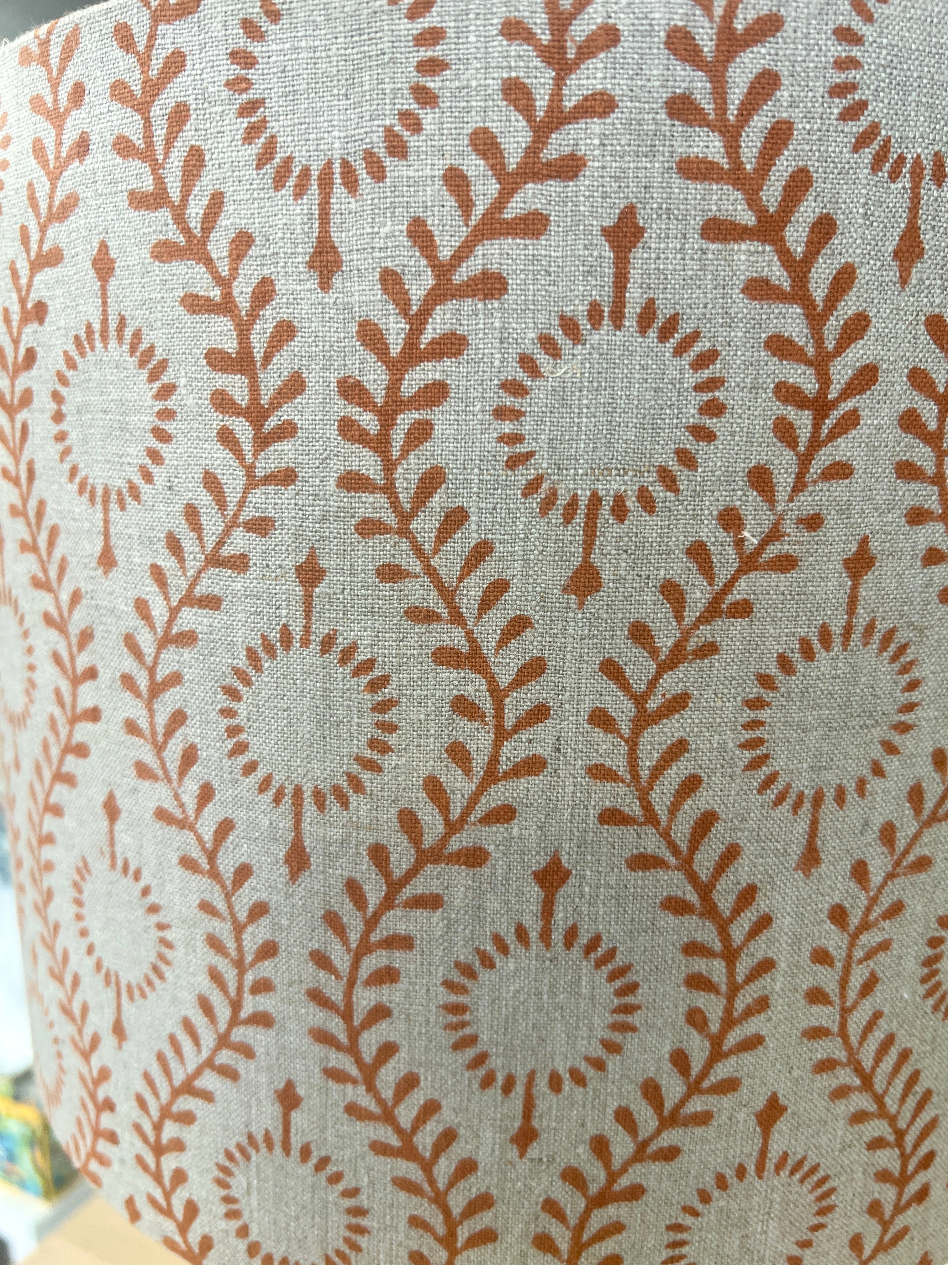 Introducing "Dharma" from The Illume Collection, a celebration of timeless artistry and modern elegance. This shade features a drum silhouette and is crafted from pure linen hand block-printed fabric, using traditional Indian techniques. The repetitive abstract orange vine pattern on the raw linen brings a casual sophistication to any space. The top and bottom of the shade have a rolled edge and are finished with a velvet blue-green cotton herringbone trim, complemented by a cream-colored cotton lining.Each lampshade is meticulously handcrafted in our Charleston, SC workshop.