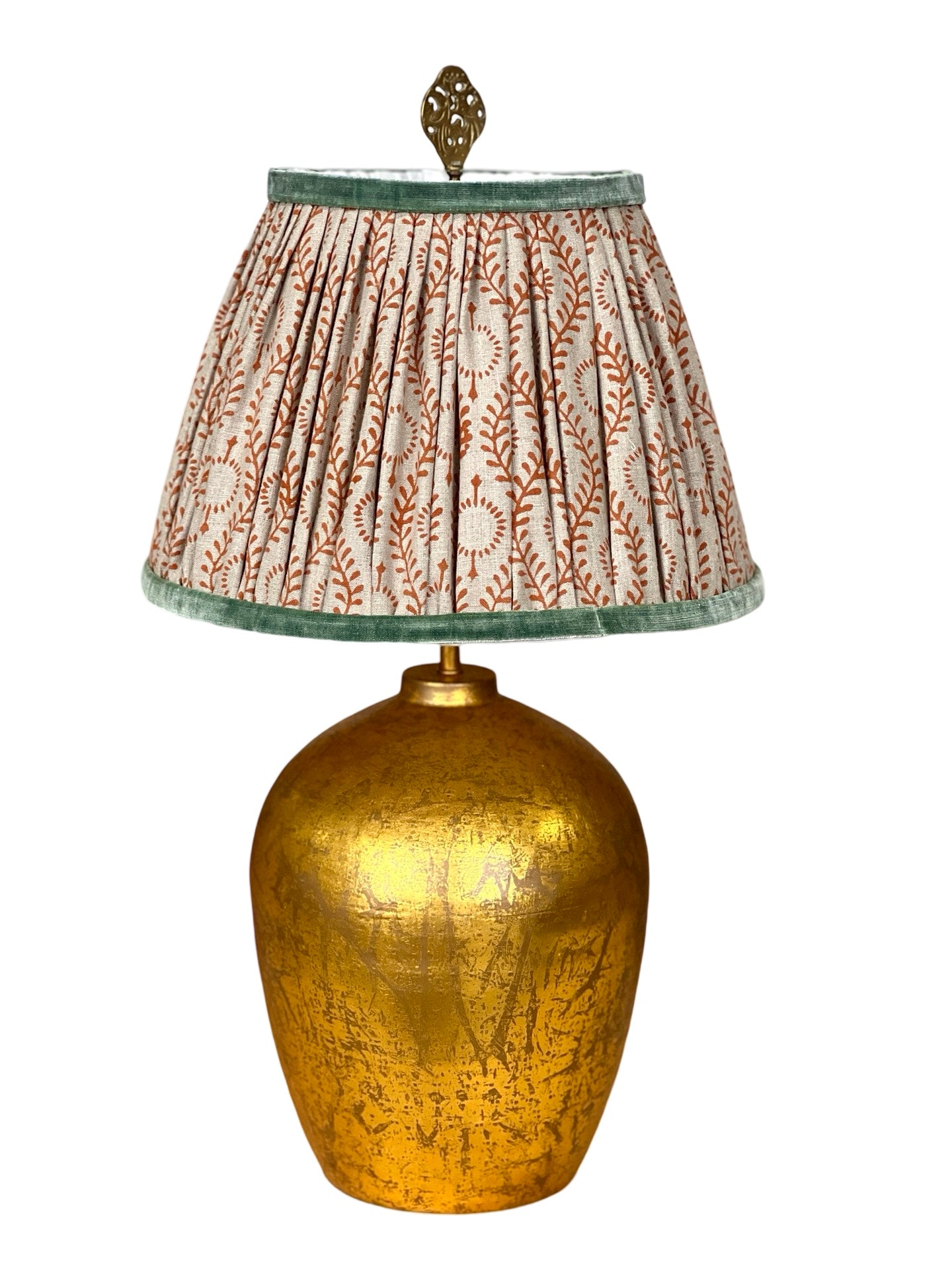 Introducing "Dharma" from The Illume Collection, a celebration of timeless artistry and modern elegance. This shade features a pleated drum silhouette and is crafted from pure linen hand block-printed fabric, using traditional Indian techniques.
