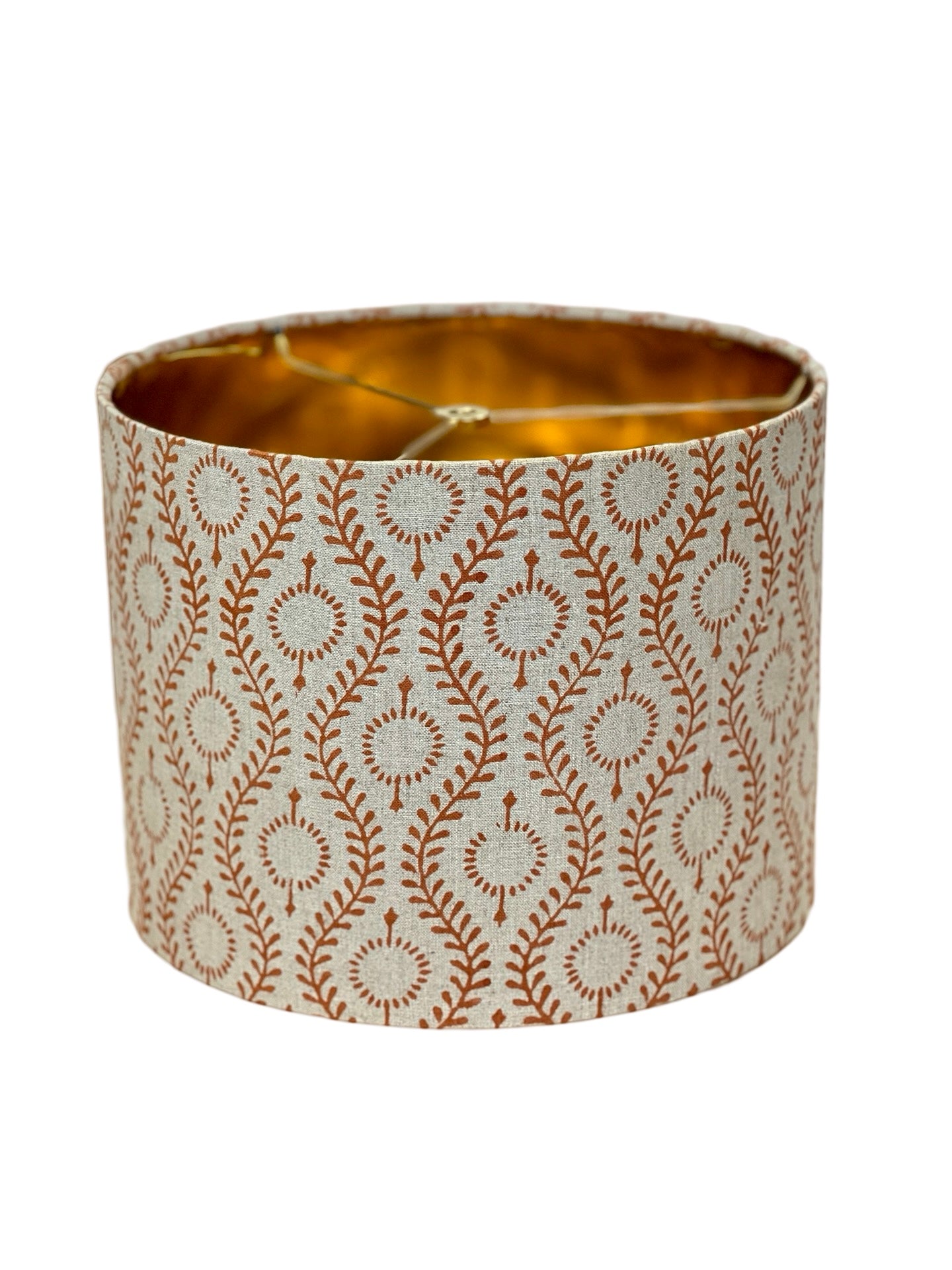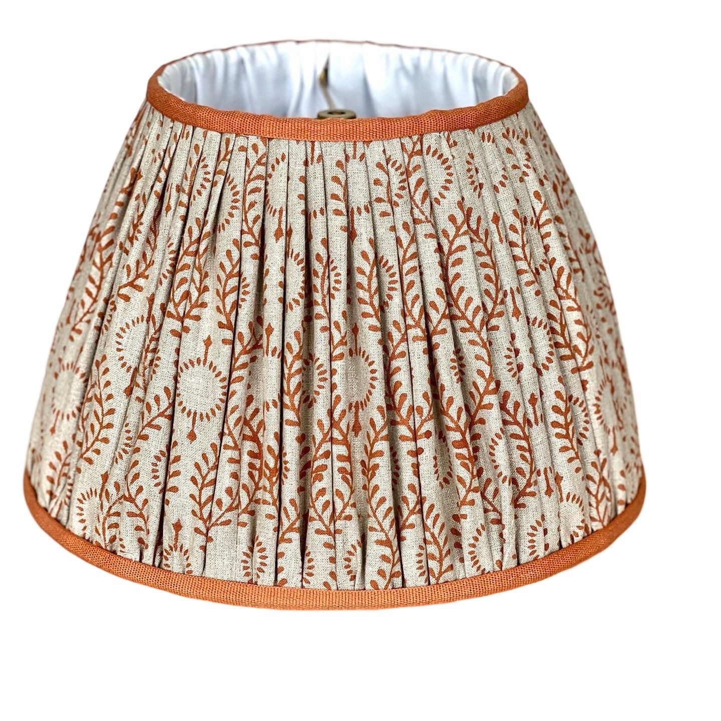 The repetitive abstract orange vine pattern on the raw linen brings a casual sophistication to any space. The top and bottom of the shade have a rolled edge and are finished with an apricot cotton herringbone trim, complemented by a cream-colored cotton lining. Each lampshade is meticulously handcrafted in our Charleston, SC workshop.
