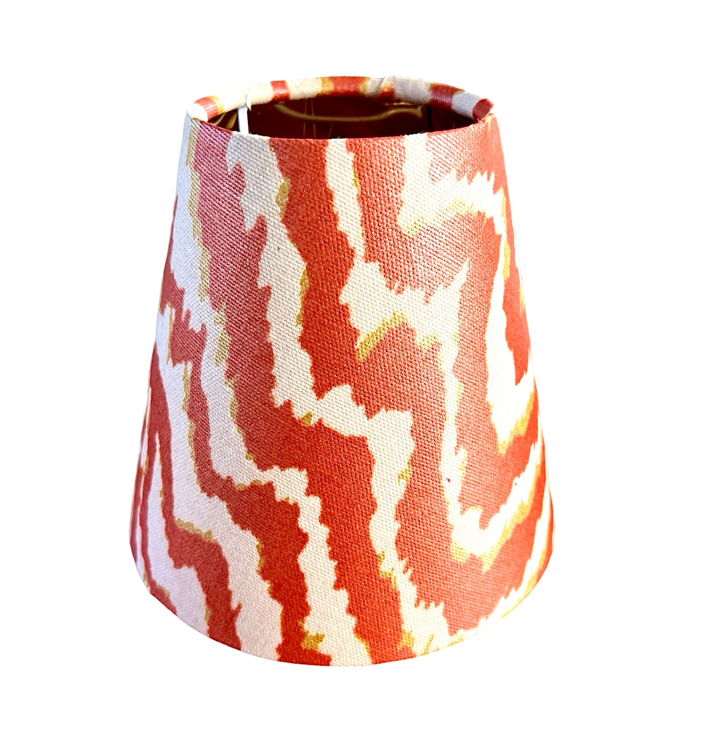 This enchanting luminescent orange and white animal print pattern with gold accents is shown on our chandelier shade. This shade is made to order in our Charleston, SC workshop and has a professionally rolled edge for that luxury, high-end look. A wonderful way to add a fun sophistication to your decor.