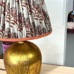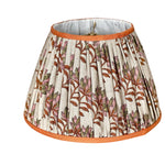 Introducing "Tejas" from The Illume Collection, a celebration of timeless artistry and modern elegance. This shade features a pleated drum silhouette and is crafted from pure linen hand block-printed fabric, using traditional Indian techniques. The repetitive peach and pink floral pattern on the raw linen brings a casual sophistication to any space. The top and bottom of the shade have a rolled edge and are finished with a salmon colored cotton herringbone trim, complemented by a cream-colored cotton lining. Each lampshade is meticulously handcrafted in our Charleston, SC workshop.